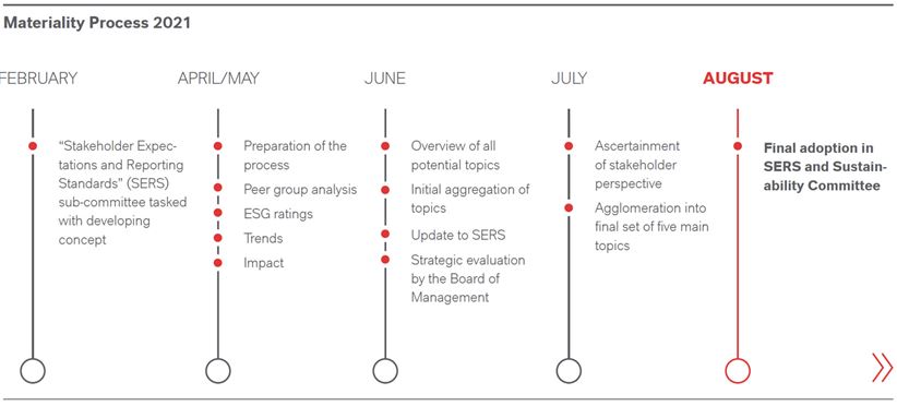 2017年为应对此后的持续性转型,我们进行了一次全面的重要性分析,并在报告年度开展了一次新的分析。我们将可持续发展议题的数量从七个精简到五个,同时更加关注循环经济等重要的新议题。2021年8月,可持续发展委员会确认了这五项主要议题。这些议题为我们提供了相关管理框架,也影响了我们关于企业责任议题的外部报告的结构。